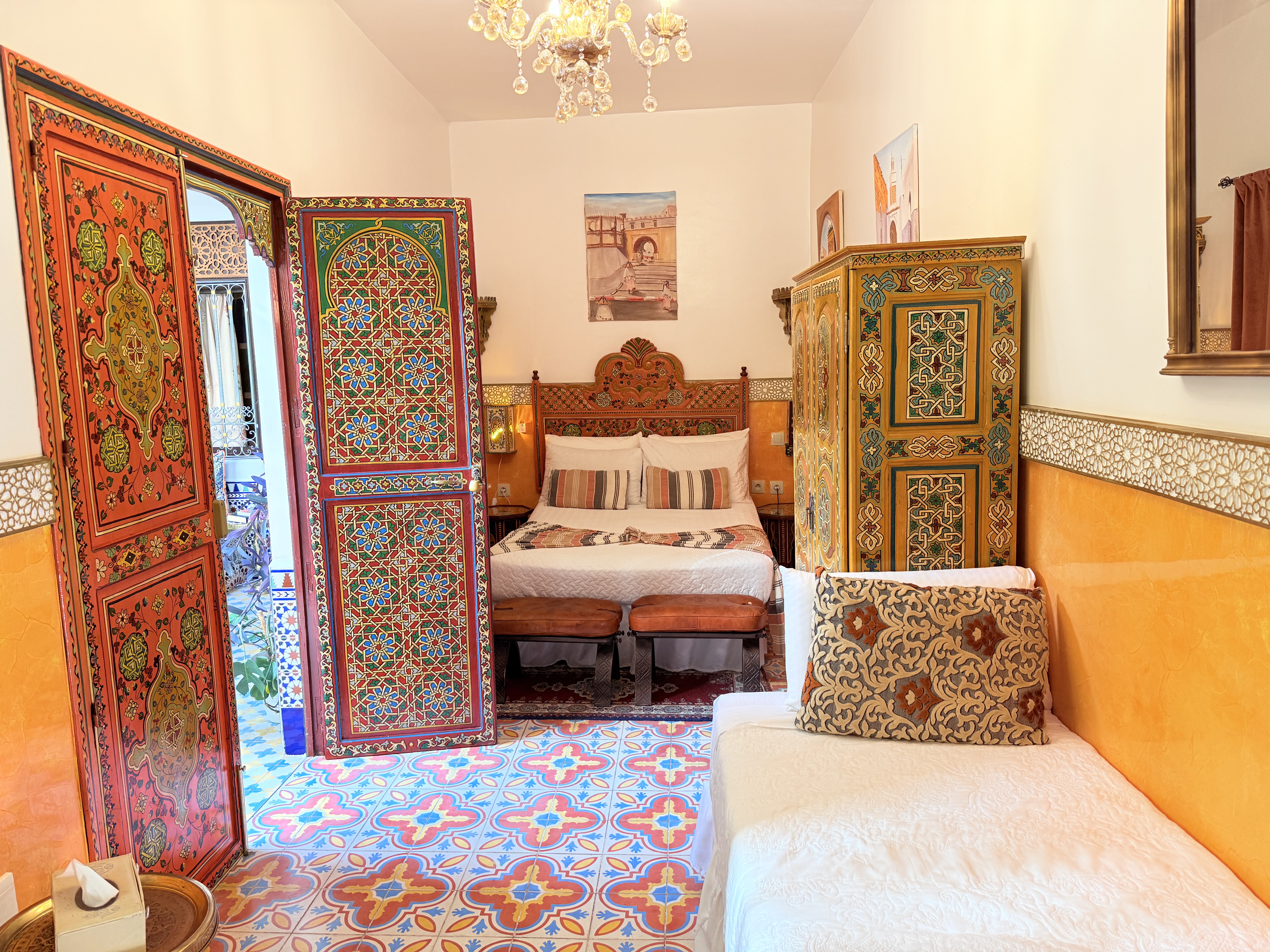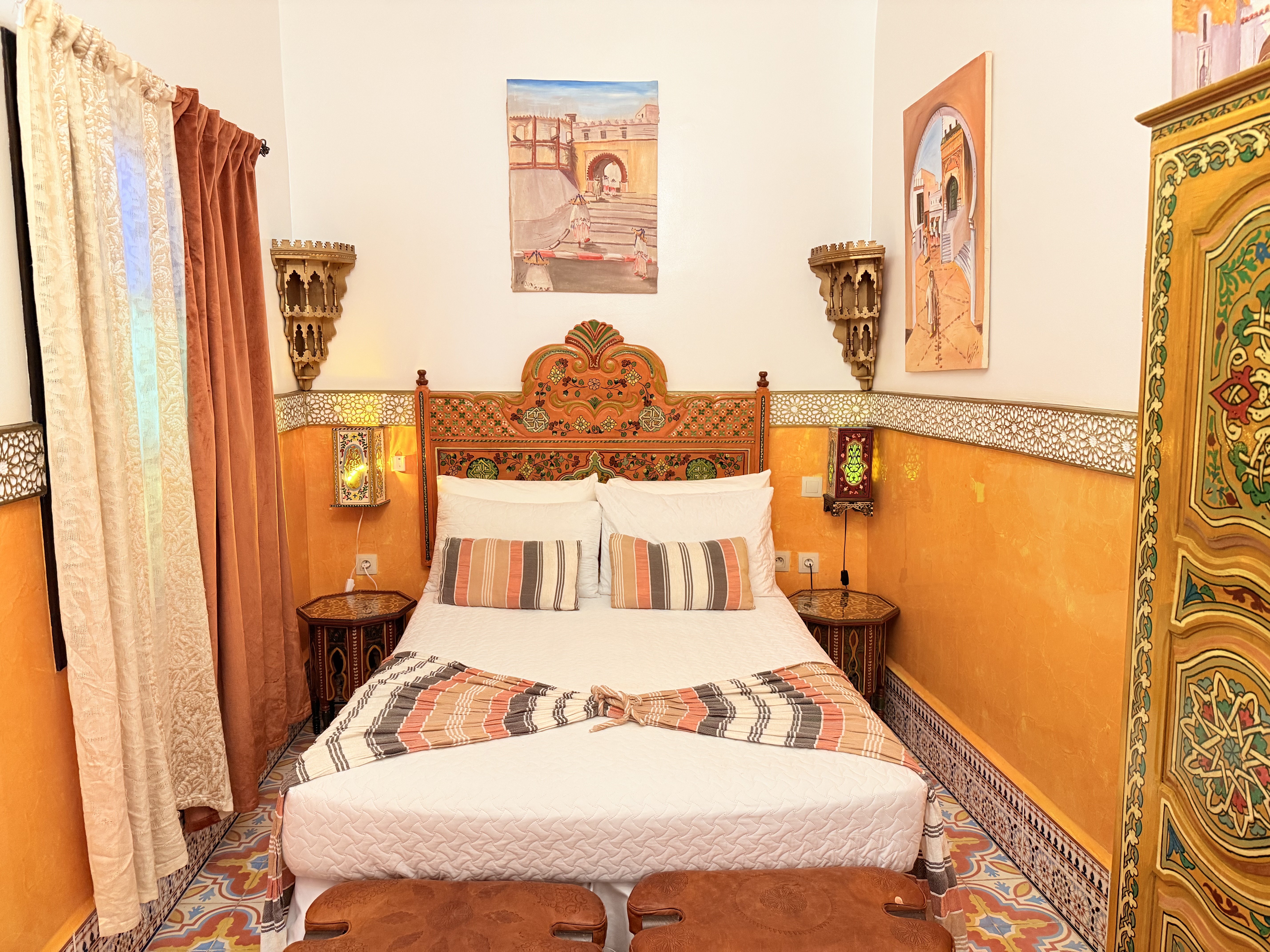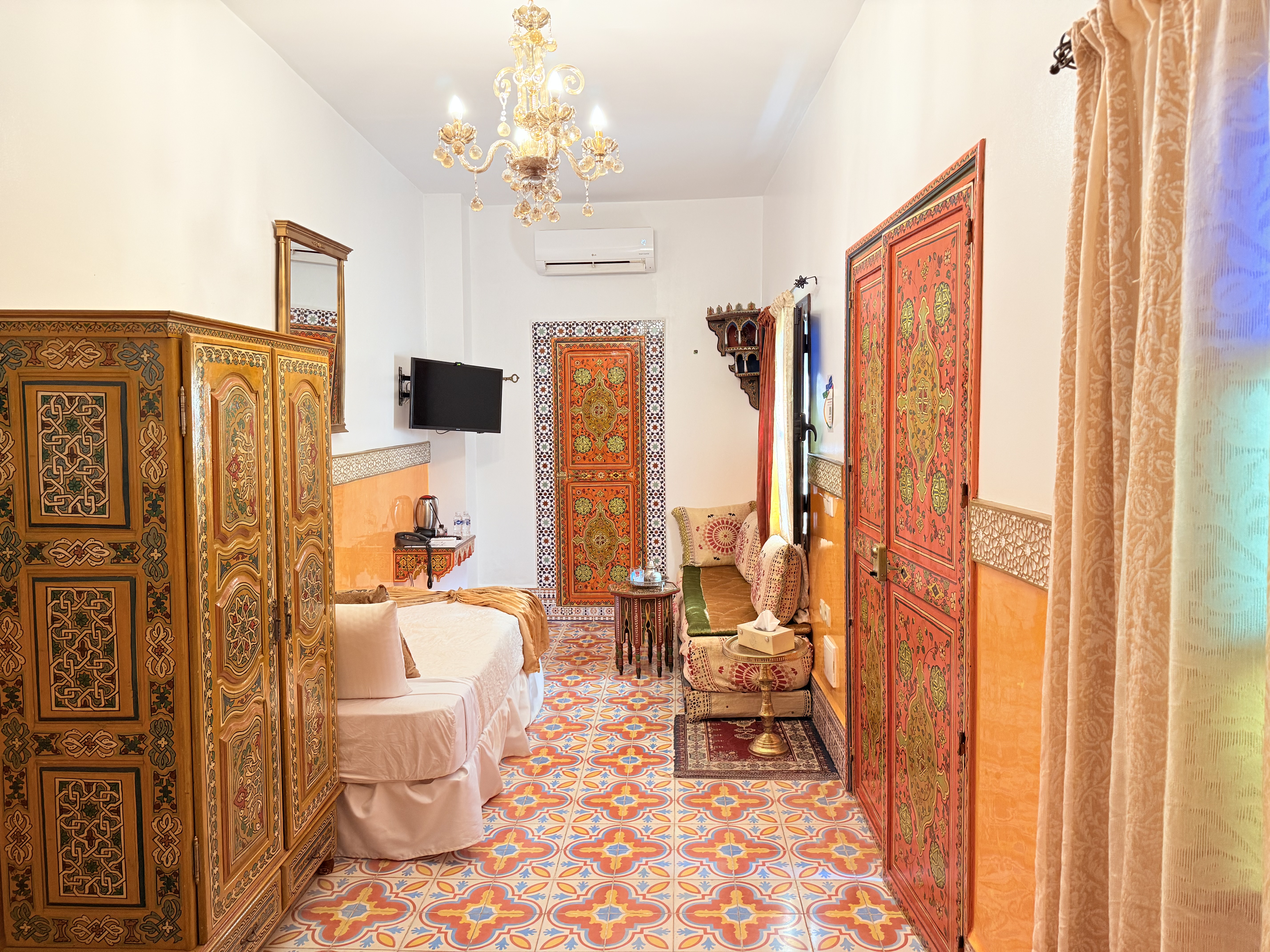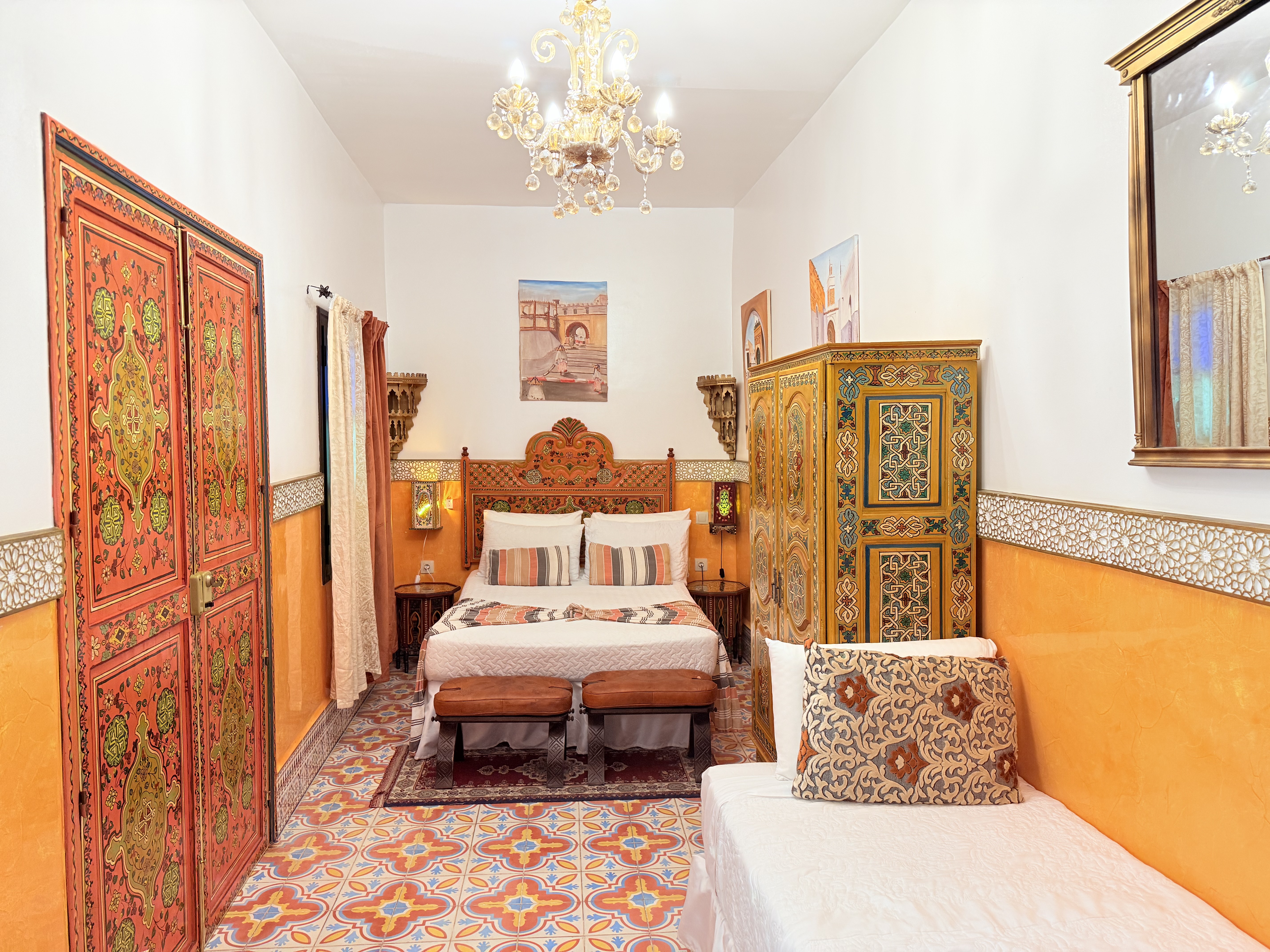 Sumérgete en la historia y la elegancia de Oriente en la habitación Harun al-Rachid en Riad Las Mil y Una Noches. Nombrada en honor al famoso califa de Bagdad, esta habitación te transporta a un mundo de lujo y sofisticación en el corazón de Tetouan.